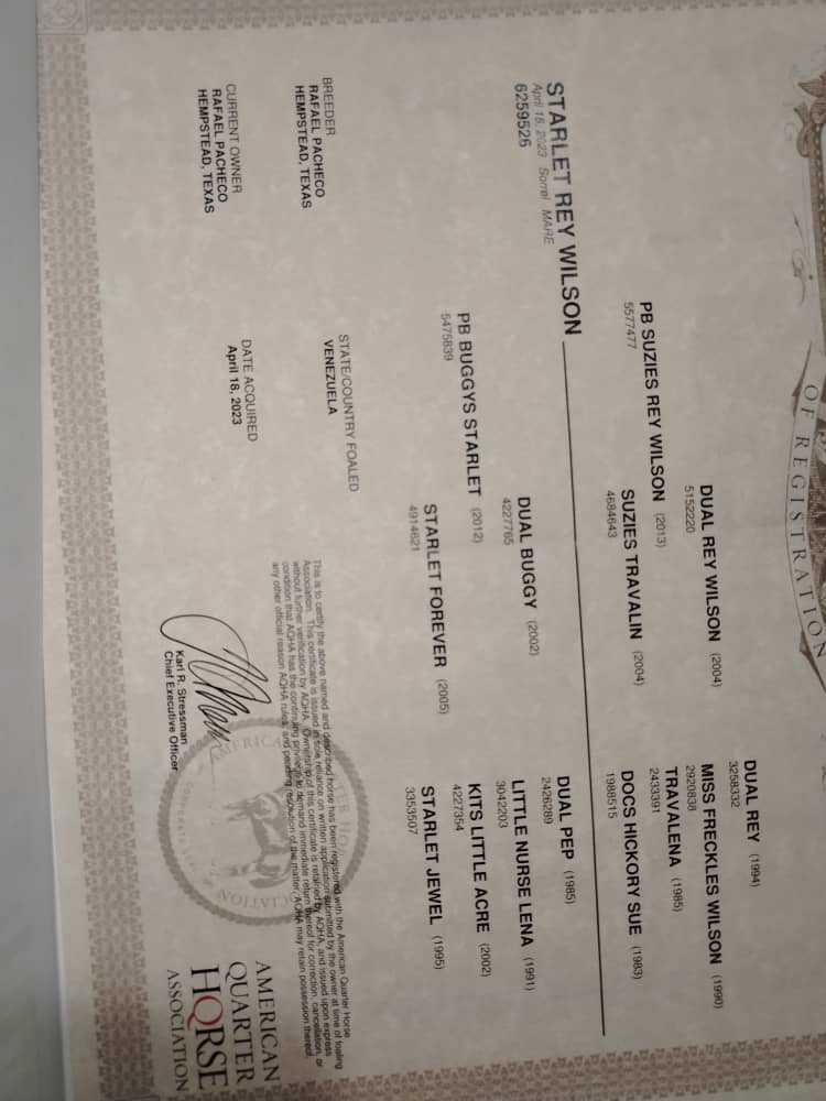 Valor de Reventa y Cría: Como futura madre, su registro asegura que su descendencia mantendrá el valor y la calidad de los grandes sementales americanos.